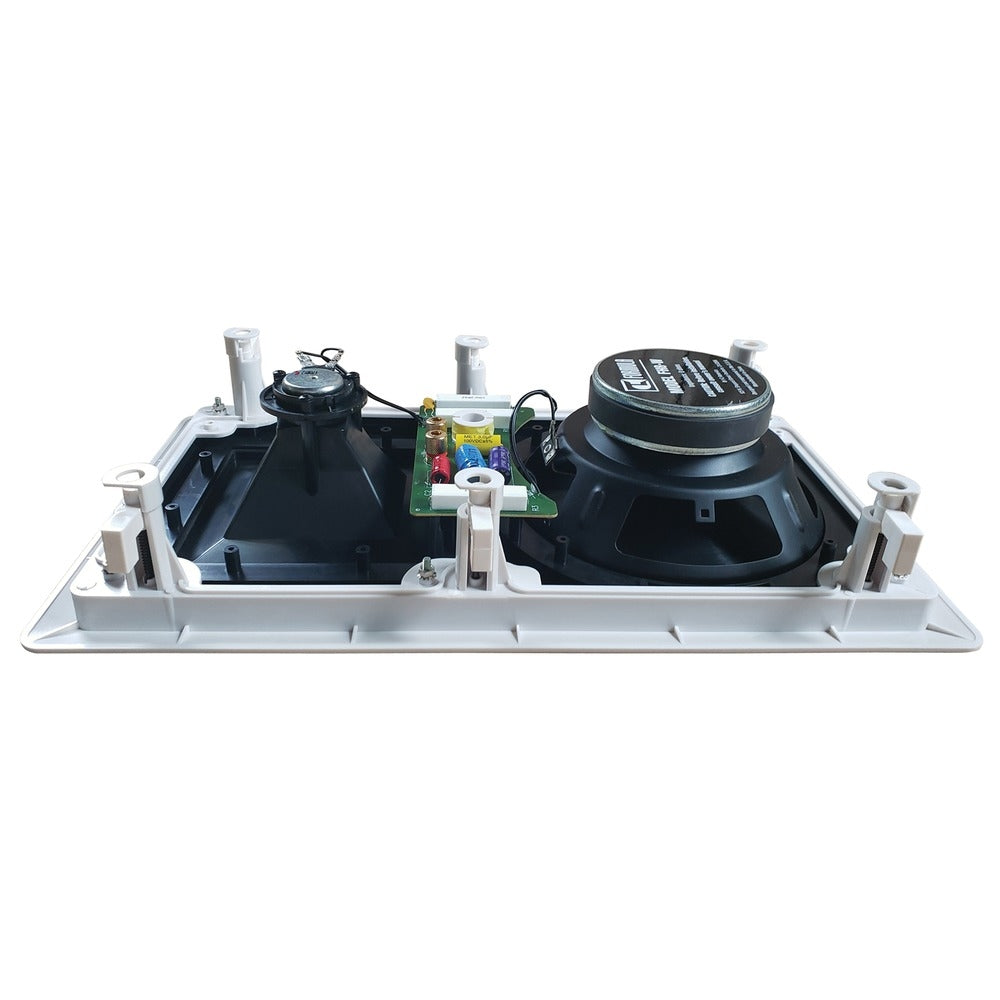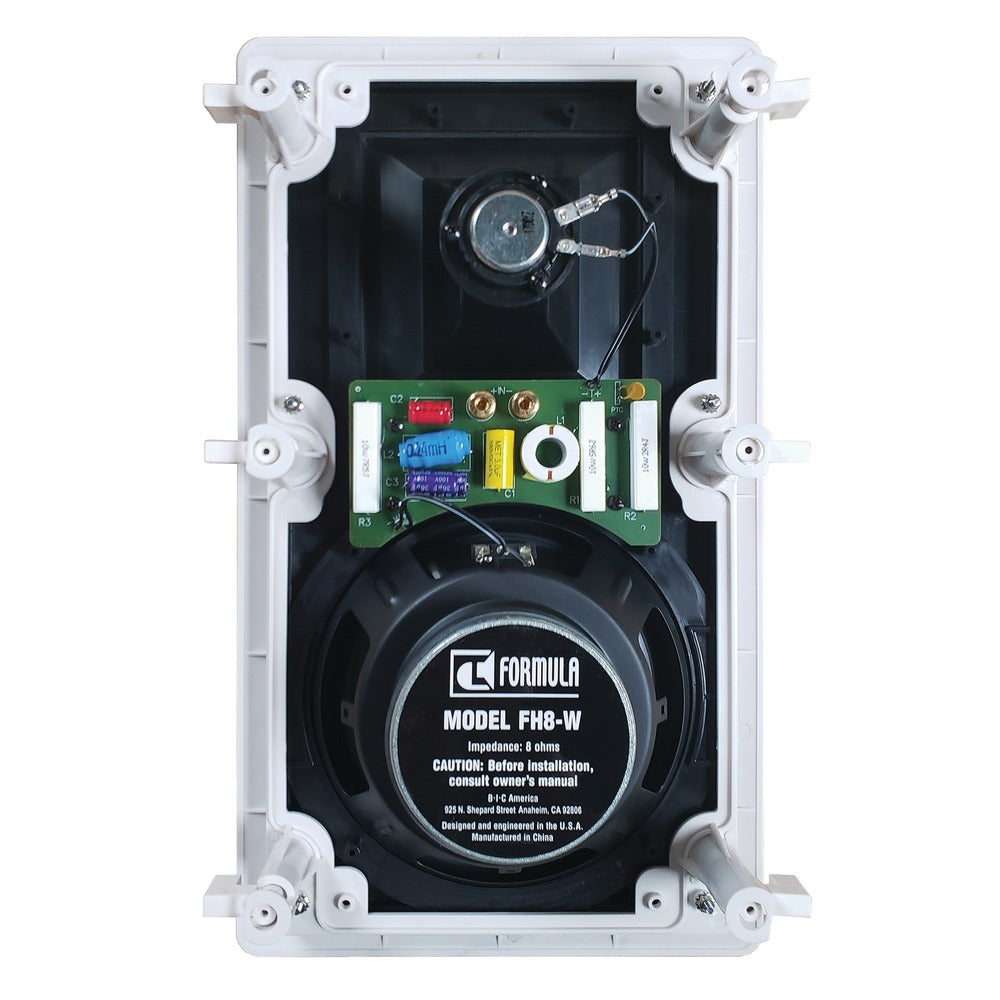 The FH-8W speakers feature a mid/high frequency horn driver that delivers highs beyond audible range, as well as extremely accurate mid frequencies. This, combined with the heavy-duty 8" injection molded woofers, enables louder and deeper output than one would expect from an in-wall speaker.