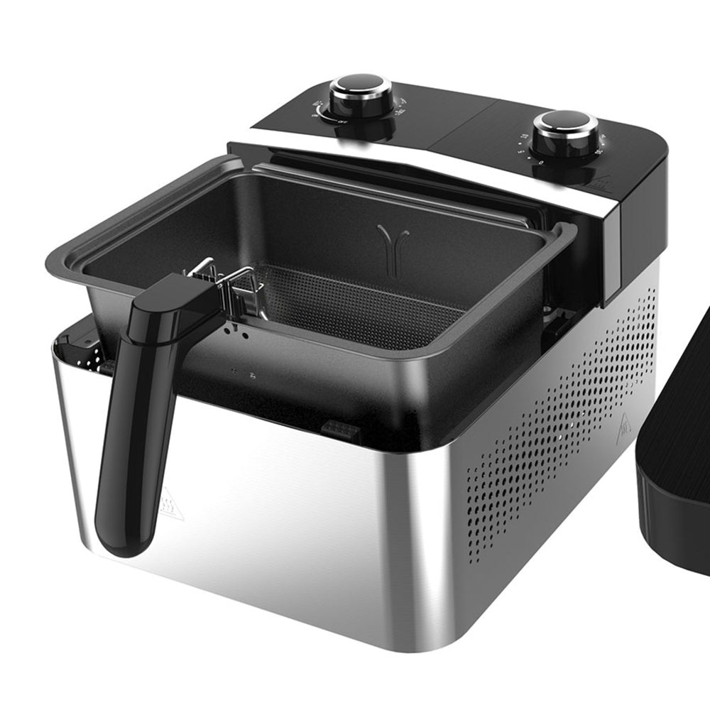 This stand-alone air fryer is constructed with durability in mind. Its sleek black and silver design adds a touch of elegance to any kitchen countertop. The cool touch handle ensures safe handling of the fryer during and after cooking.