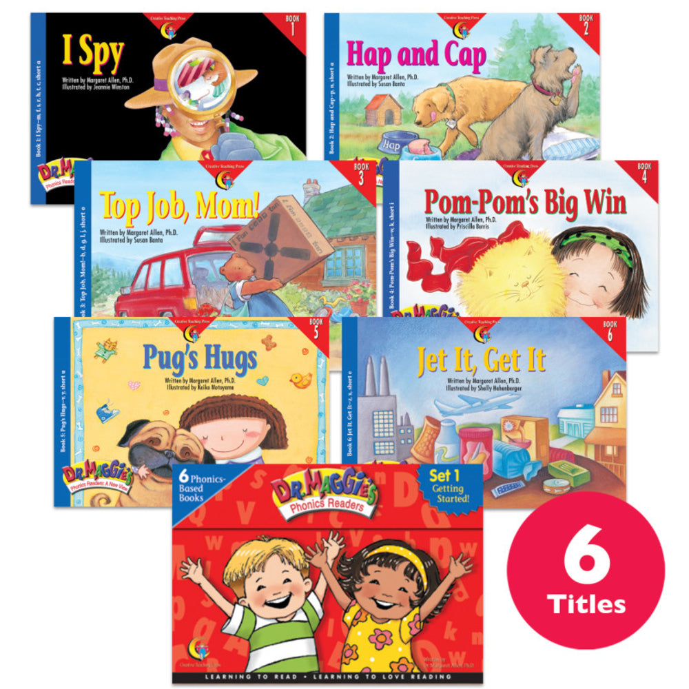 The Dr. Maggie's Phonics Readers series is rooted in current, cutting-edge phonics research. The combination of fun, high-interest stories that kids read over and over with a progression of skills that build from book to book allows children to read successfully while learning their letters and sounds, rather than only after they learn these concepts. Parents will be thrilled to see how eager their children are to read more and more. Includes six readers: I Spy, Hap and Cap, Top Job, Mom!, Pom-Pom's Big Win, Pug's Hugs, and Jet It, Get It, and a parent guide.