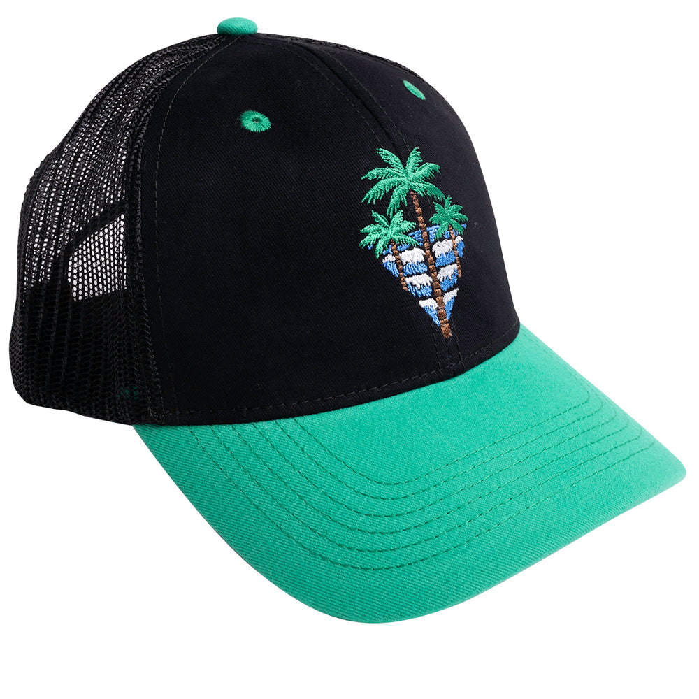 Add a touch of tropical flair to your outfit with our Palm Tree Cap! This stylish black and green cap features a palm tree graphic, perfect for those who love the beach and warm weather. Made of cotton, it is comfortable to wear and has a mesh back for good ventilation, making it ideal for outdoor activities. The snap in the back allows for an adjustable fit, ensuring a comfortable and secure feel.