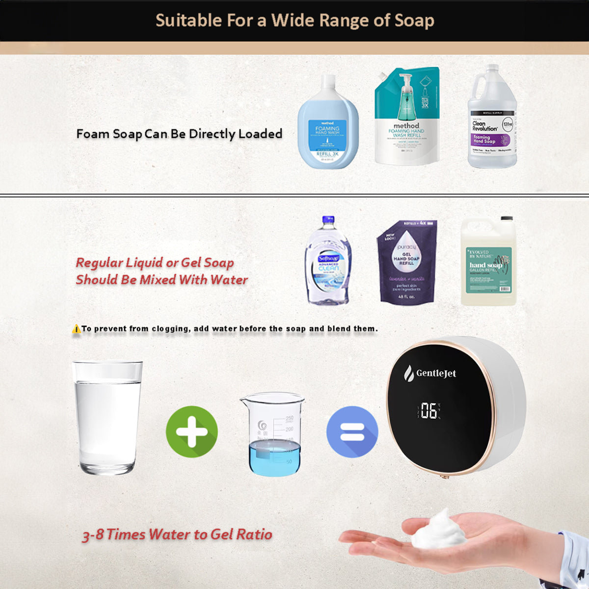 Our versatile dispenser works with various soaps. NOTE: Gel soaps must be diluted (1 part soap to 3 parts water); avoid using soaps with particles to prevent clogs.